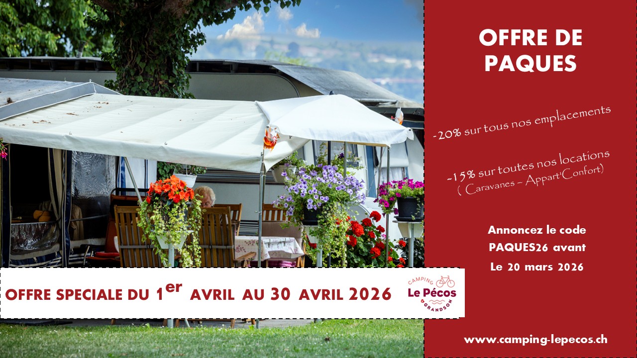 Offre spéciale du 1er Avril au 30 Avril 2026-20% sur tous nos emplacements-15% sur toutes nos locations (Caravanes - Appart'Confort)Annoncez le code : "PAQUES26" avant le 20 mars 2026